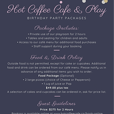 Host your private event in our upscale cafe equipped with a children's play area. Ideal for birthdays, gatherings, and family celebrations, providing entertainment and premium service for your guests. 🎉 Birthday Party Information - Hot Coffee Café & Play 🎈 Party Package – $275 plus tax Includes: ✅ 2 Hours of reserved party time ✅ Exclusive use of room ✅ Access to cafe menu for additional food purchases (Pre-ordering recommended) ✅ 10 Free Kids Hot Chocolates coupons - For Goodie Bags Optional Food Package $49 plus tax ✅ 2 Pizzas (Choice of Cheese or Pepperoni) ✅ 1 Jug of Juice or Pop Food & Cake Policy 🍕 Outside food is not permitted. 🍽️ Additional food and drinks can be purchased from our café menu. 👉 Please let us know in advance what you'd like to order. 🎂 You may bring your own cake or cupcakes. Additional 30 minutes available for some bookings - Add on Important Party Guidelines 👟 Socks must be worn by all attendees (kids & adults). 🧍 Maximum 10 children per party. - Contact us if there might be extra children. 🕑 Please be respectful of your 2-hour time limit. ✅ All attendees MUST complete our waiver before entering the playroom. Birthday party check in will be scheduled for same time as the birthday party so its easy to find and complete. 🚫 Anyone without a completed waiver will not be permitted in the play area. 📍 Have Questions or Want to Book? Stop by the café or contact us directly — we’d love to celebrate with you!